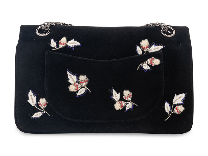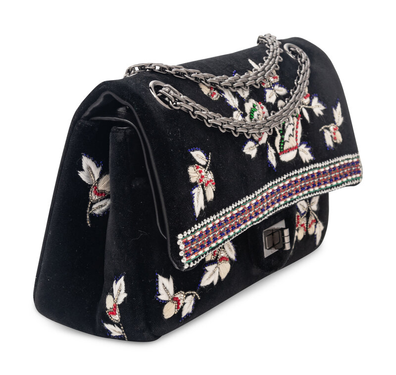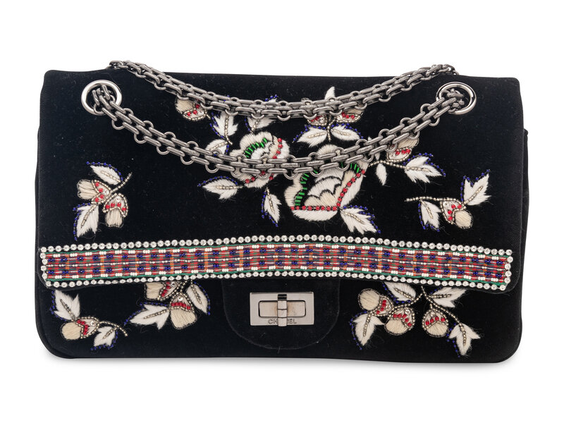 Chanel 225 2.55 Reissue Double Flap Shoulder Bag in Black Silk Velvet with All-Over Floral Motif Embroidery & Beading with Gunmetal-Tone Hardware. Embroidery is likely embroidered by Lesage. Mademoiselle Turn-Lock Closure and Metal Chain Strap.