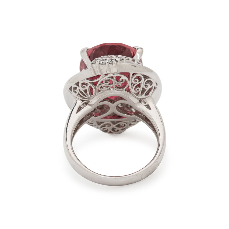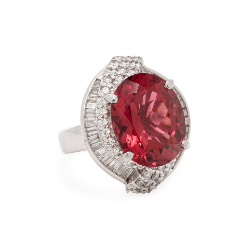 Oval faceted pink tourmaline measuring approximately 15.90 x 12.70 x 9.30 mm and round brilliant and baguette cut diamonds weighing approximately 1.38 carats total. Platinum. Ring size 6.