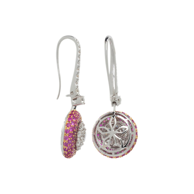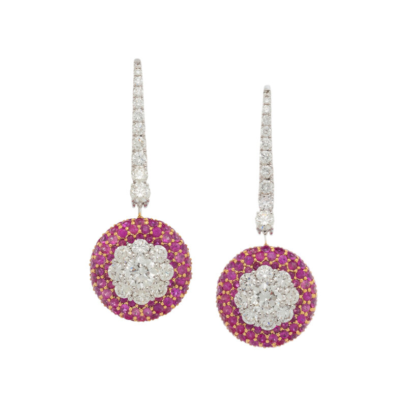 Round faceted rubies and round brilliant cut diamonds weighing approximately 2.50 carats total. White and yellow gold. 1 1/2 inches long.