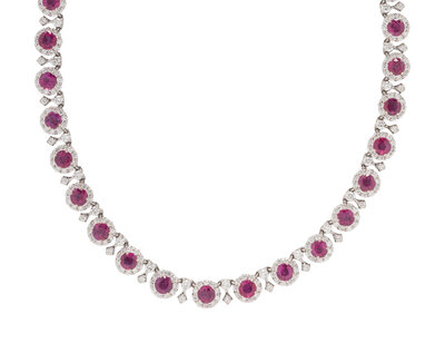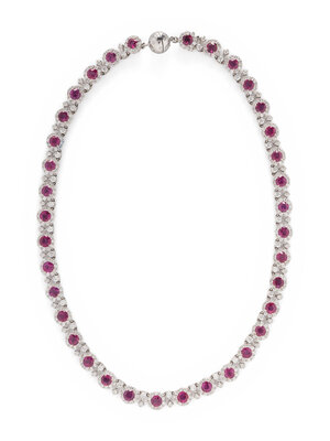 Round faceted rubies and round brilliant cut diamonds weighing approximately 12.85 carats total. 14 karat white gold. 16 inches long.