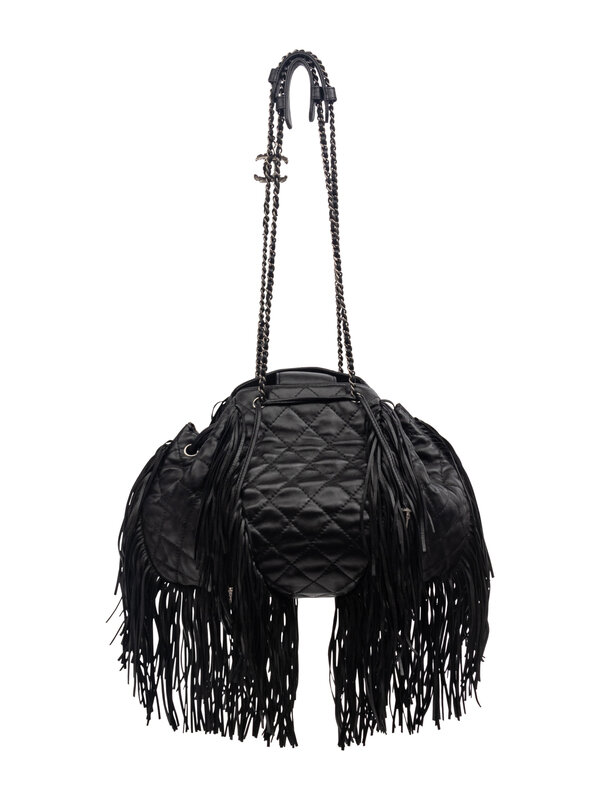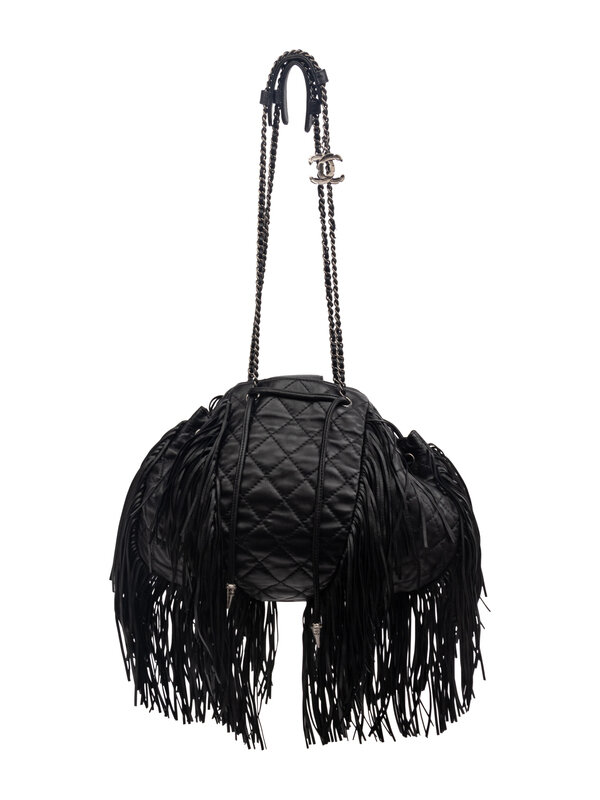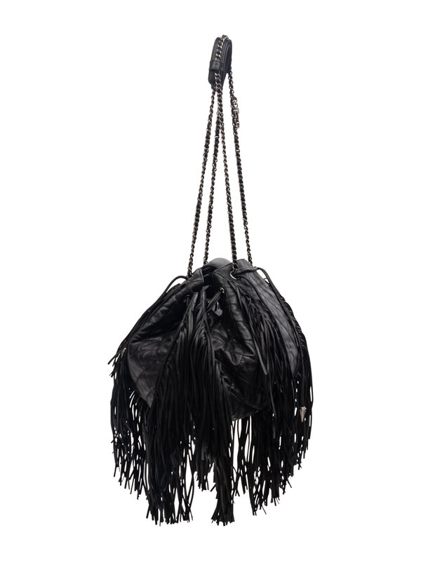 Chanel Fringed Sac Cordon Bag in Quilted Black Lambskin Leather with Ruthenium Hardware. Drawstring and Magnetic Snap Closure and Interwoven Leather-Metal Chain with CC Charm.