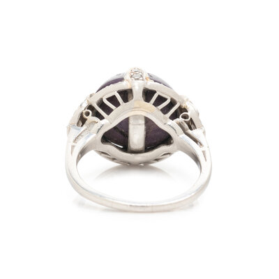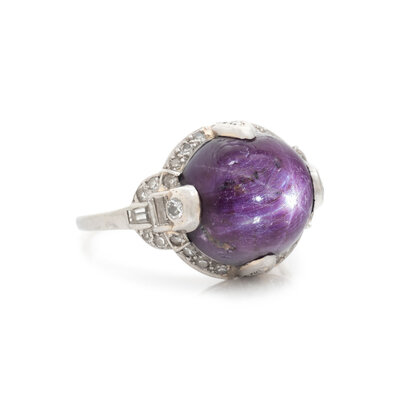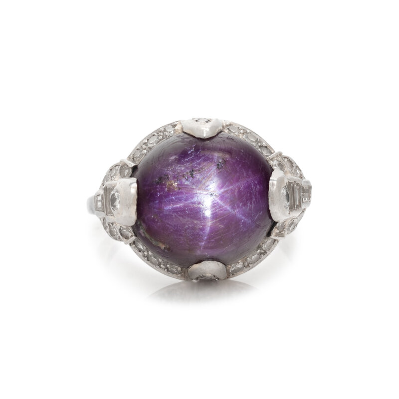Oval cabochon star ruby measuring approximately 11.80 x 12.15 x 9.20 mm, accented by single, round brilliant, and baguette cut diamonds. Platinum. Ring size 5 3/4.