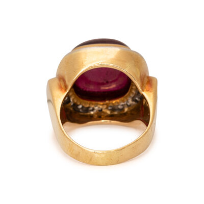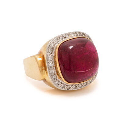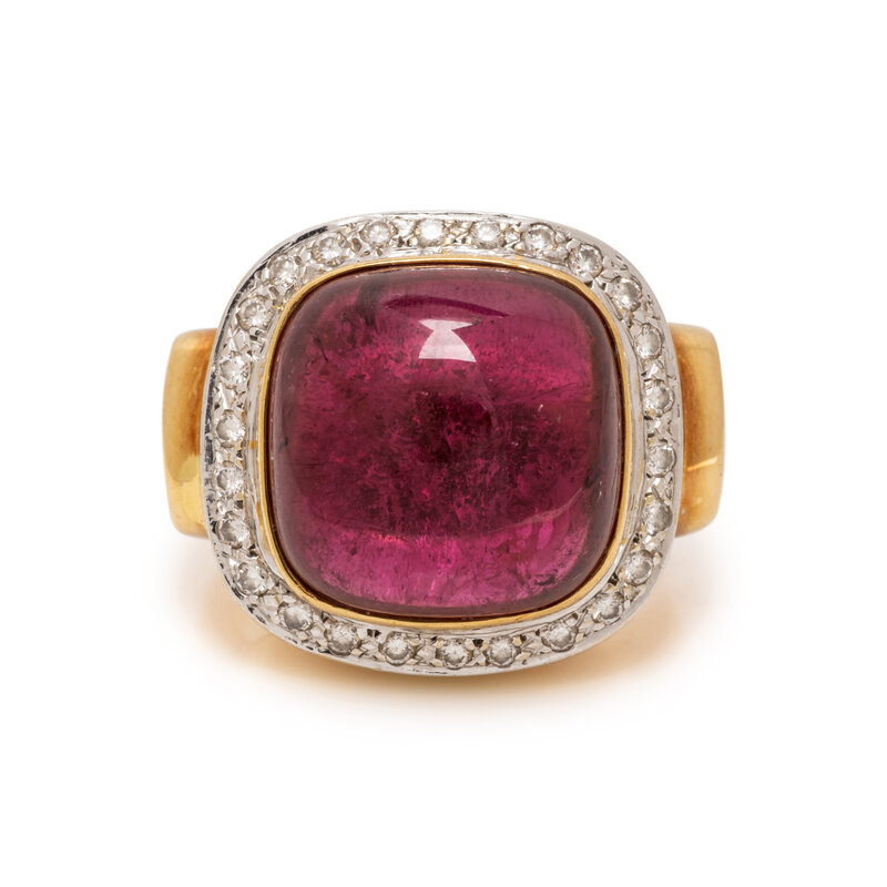 Cabochon pink tourmaline measuring approximately 15.00 x 15.00 x 7.45 mm and round brilliant cut diamonds weighing approximately 0.25 carat total. 18 karat yellow and white gold. Ring size 9.