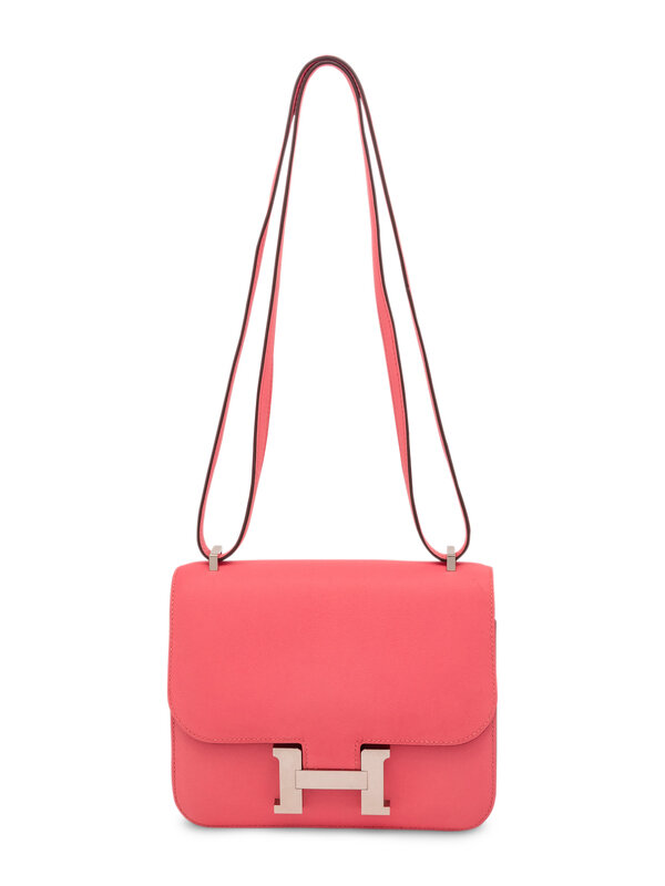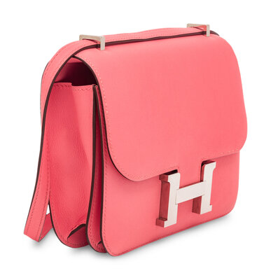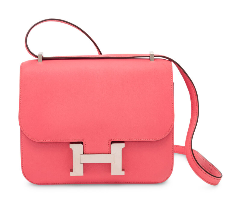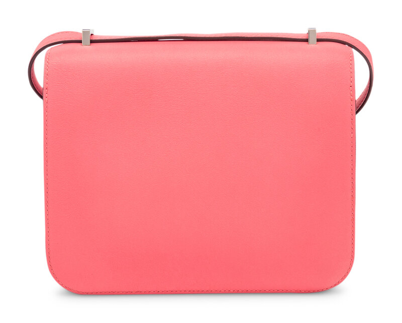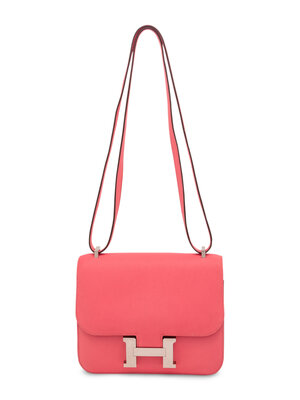 Mini Constance 18 in Flap Shoulder Bag in Rose Azalee Swift Leather with Palladium Hardware.