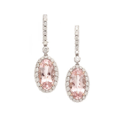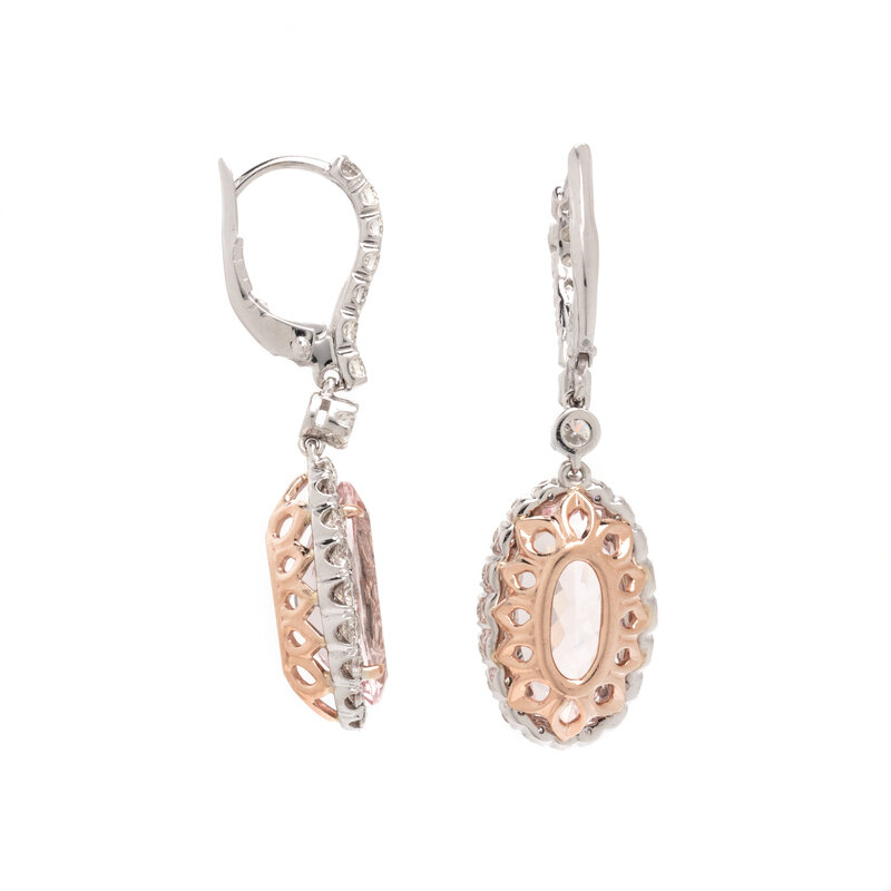 Oval faceted morganite measuring approximately 13.85 x 7.10 x 5.10 mm and round brilliant cut diamonds weighing approximately 1.50 carats total. 14 karat white and rose gold. 1 1/4 inches long.