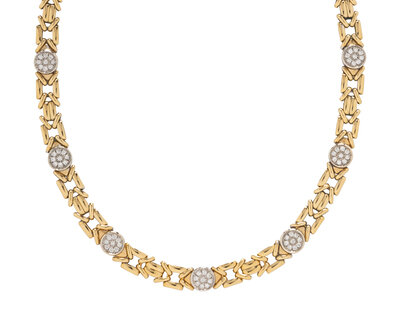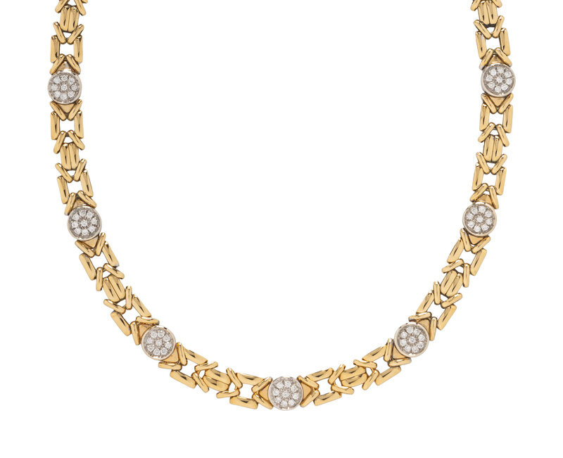 Round brilliant cut diamonds. 18 karat yellow and white gold. 17 1/4 inches long.