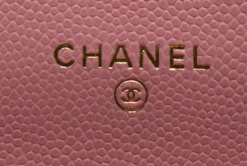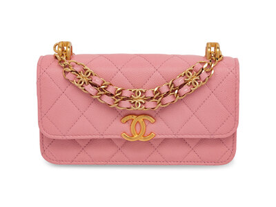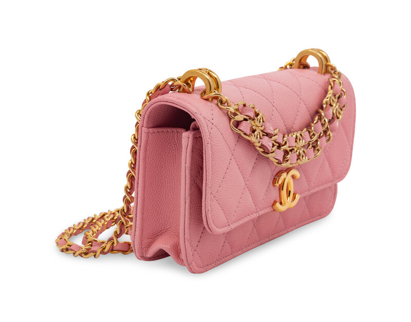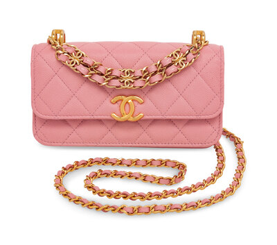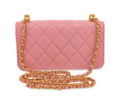 Chanel Coco First Phone Holder in Quilted Pink Caviar Leather with Aged Gold-Tone Hardware. CC Magnetic Snap Closure and Interwoven Leather-Metal Chain Strap & Handle.