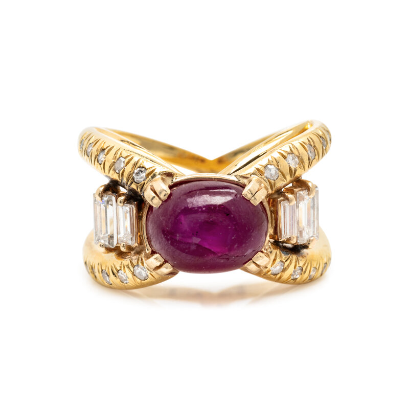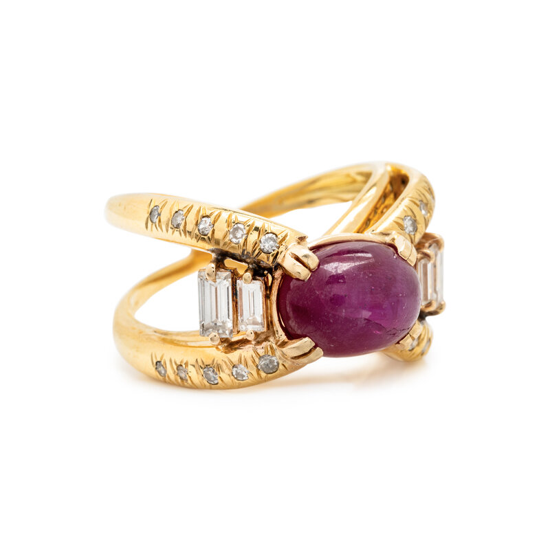 Oval double cabochon star ruby measuring approximately 10.65 x 8.20 x 7.90 mm, four baguette and 20 single cut diamonds. Yellow gold. Ring size 7.