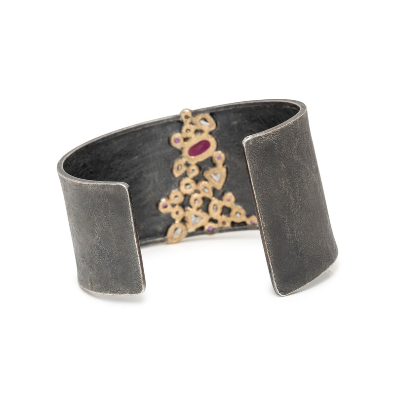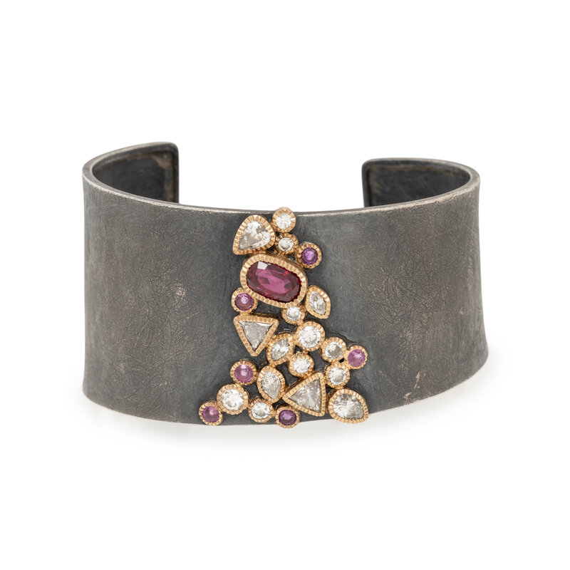 TODD REED, HAND FORGED STERLING SILVER AND YELLOW GOLD MULTIGEM CUFF BRACELET
