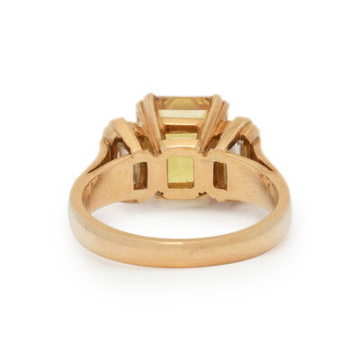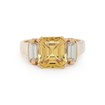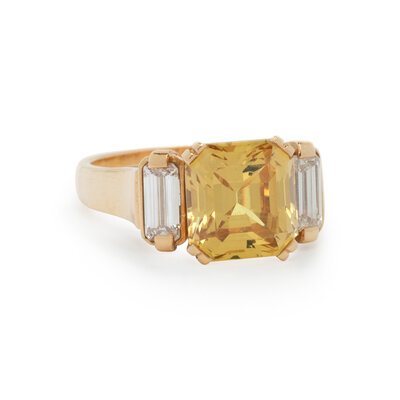 Emerald cut yellow sapphire measuring approximately 9.10 x 8.50 x 6.00 mm and emerald cut diamonds. 18 karat yellow gold. Ring size 5 1/2.