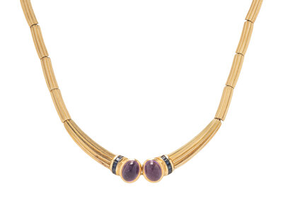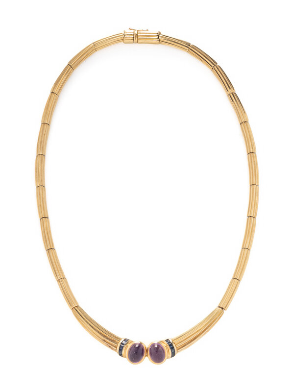Oval cabochon amethysts measuring approximately 10.20 x 7.80 x 5.40 mm and calibre cut sapphires. 18 karat yellow gold. 16 1/2 inches long.
