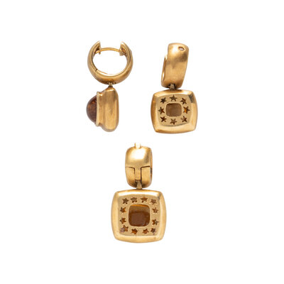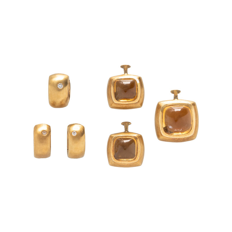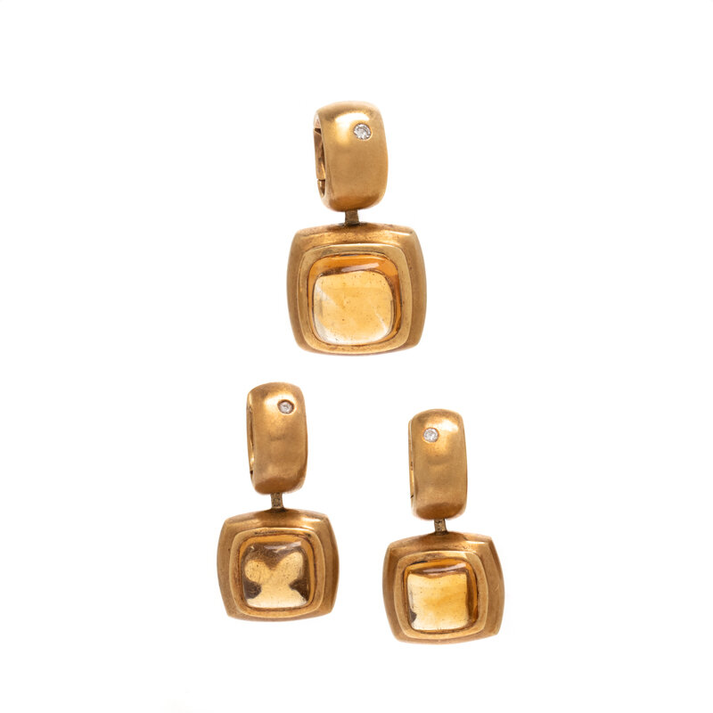 The pendant set with a cabochon citrine measuring approximately 10.00 x 10.00 x 6.15 mm and a round brilliant cut accent diamond, and the pair of earrings set with cabochon citrine measuring approximately 7.55 x 7.55 x 4.60 mm and round brilliant cut diamonds. 18 karat yellow gold. Pendant: 1 inch long. Earrings: 7/8 inch long.