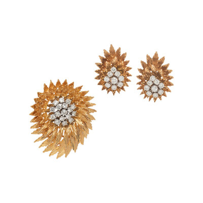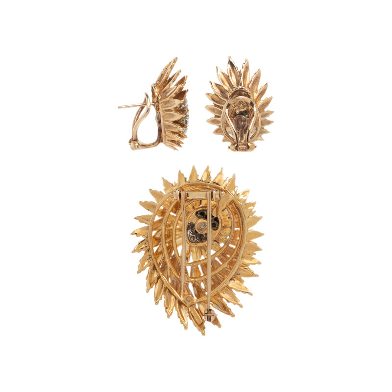 RETRO, YELLOW GOLD AND DIAMOND BROOCH AND EARRINGS
