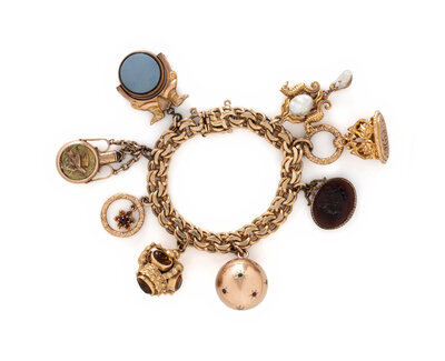 With three watch fobs and five charms attached. Yellow gold. 7 inches long.