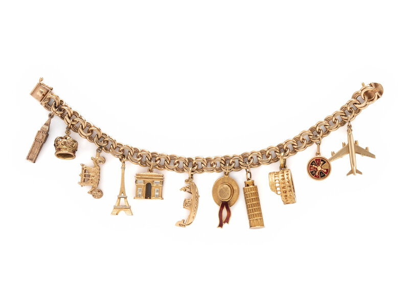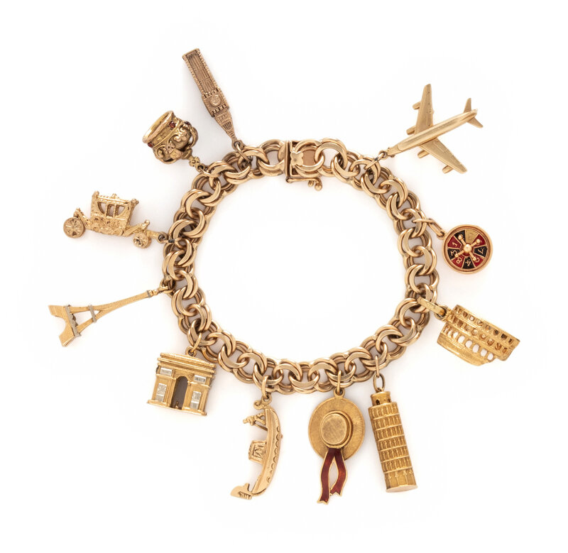 Eleven travel-themed charms attached, two with enamel. Yellow gold. 8 inches long.