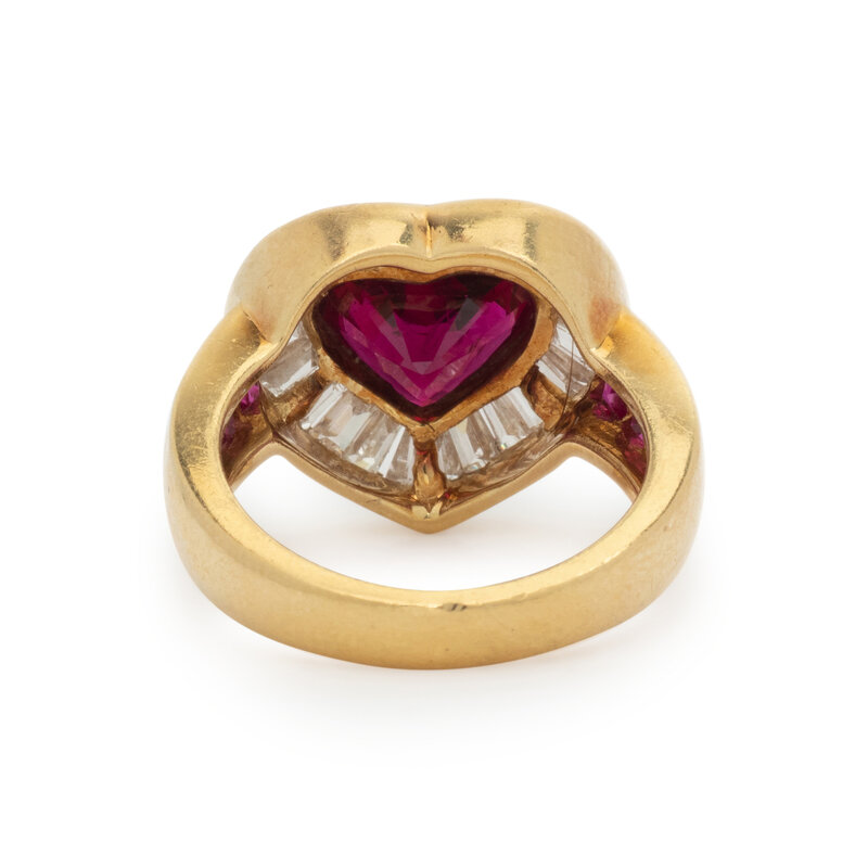 Heart shaped ruby measuring approximately 9.00 x 7.40 x 5.25 mm, calibre cut rubies, and baguette cut diamonds weighing approximately 1.50 carats total. 18 karat yellow gold. Ring size 6.