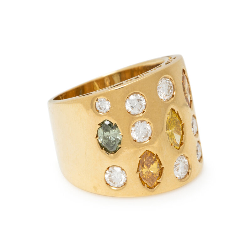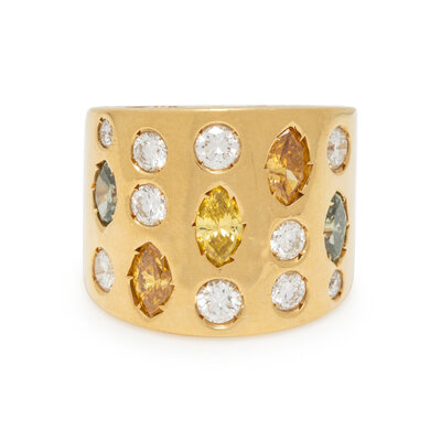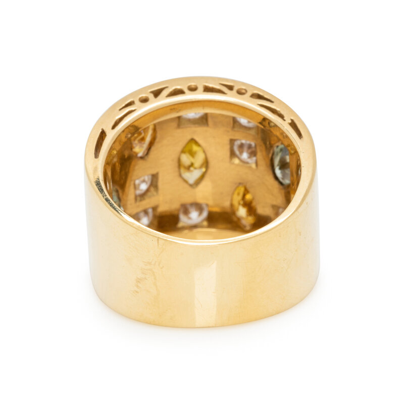 Marquise cut green, yellow, and orange diamonds (origin of color not tested) and round brilliant cut diamonds weighing approximately 1.00 carat total. 18 karat yellow gold. Ring size 6.