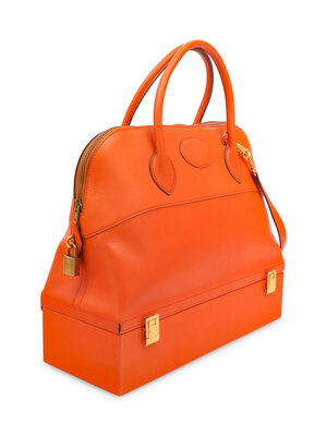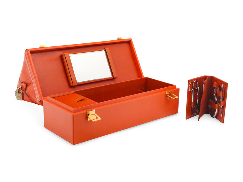 Additional Information: Gold-plated hardware, zipper closure, two top handles, orange goatskin lining, sidewall interior slip pocket, metal protective feet at base. Lower compartment with two main interior compartments, lined in orange leather; one compartment with removable sliding leather lid and velvet lining.