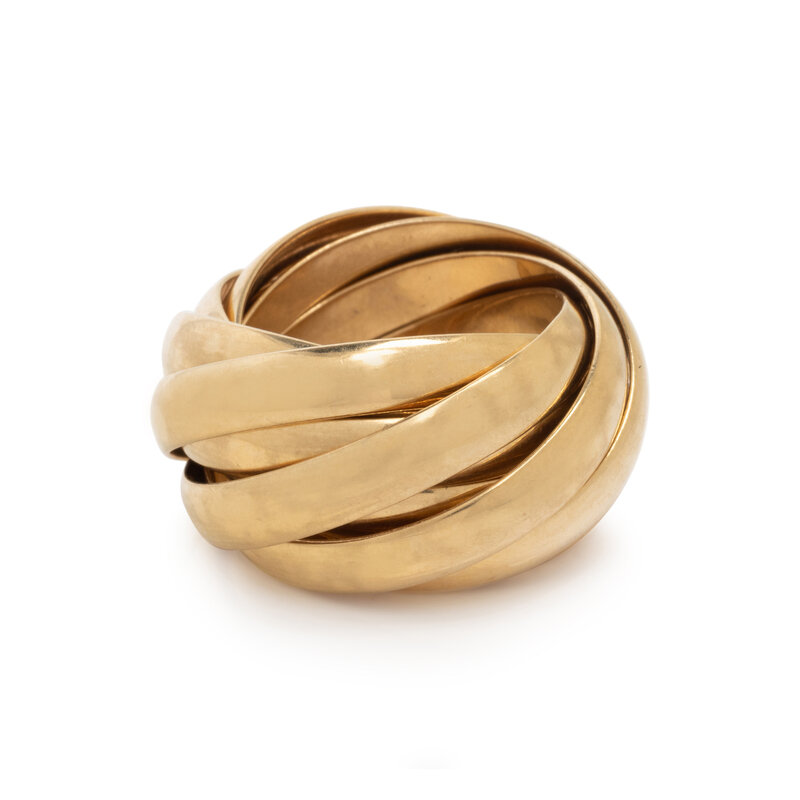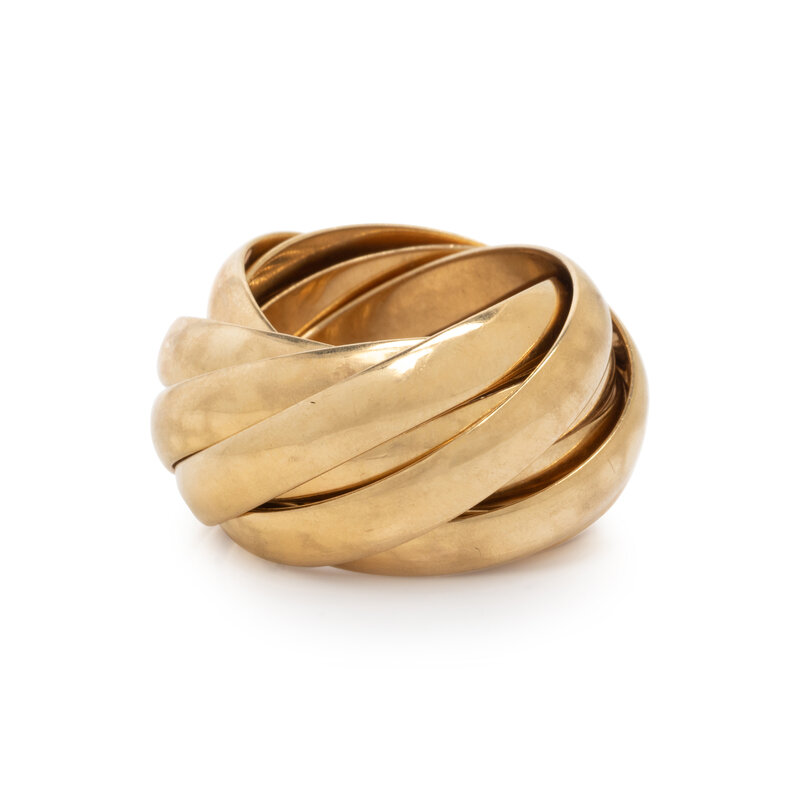 Nine intertwined rolling rings. 18 karat yellow gold. Approximate ring size 6 3/4.