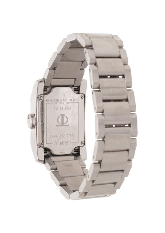 Stamps: BAUME & MERCIER GENEVE 1830 SWISS 30M STAINLESS STEEL No4656957 65522. Bracelet: TMMB BAUME & MERCIER STAINLESS STEEL.