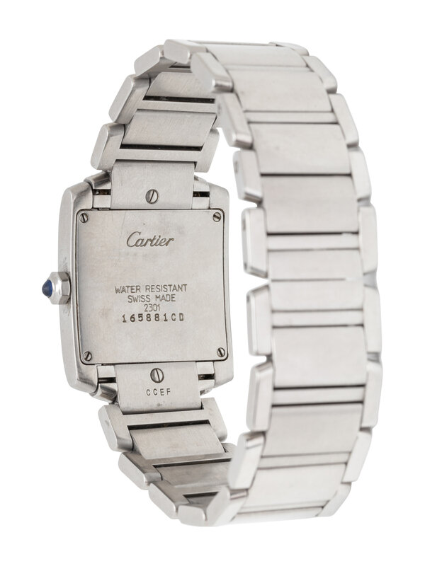 Stamps: Case back: Cartier WATER RESISTANT SWISS MADE 2301 165881CD. Clasp: Cartier SWISS MADE STAINLESS STEEL.
