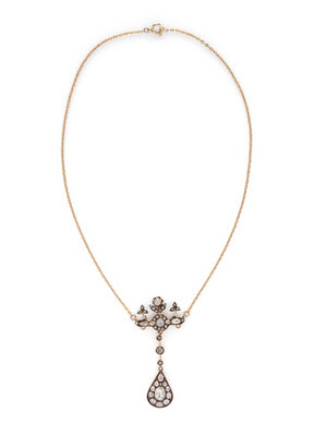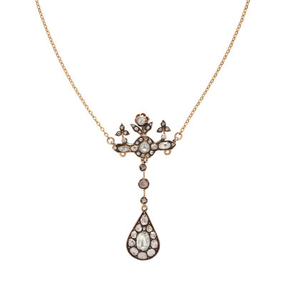 Oval rose cut diamond measuring approximately 9.20 x 6.40 mm and variously shaped rose cut diamonds and brown diamonds (origin of color not tested). Yellow gold. Pendant: 2 3/4 inches long. Chain: 18 inches long.