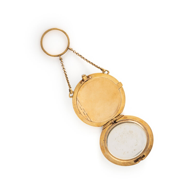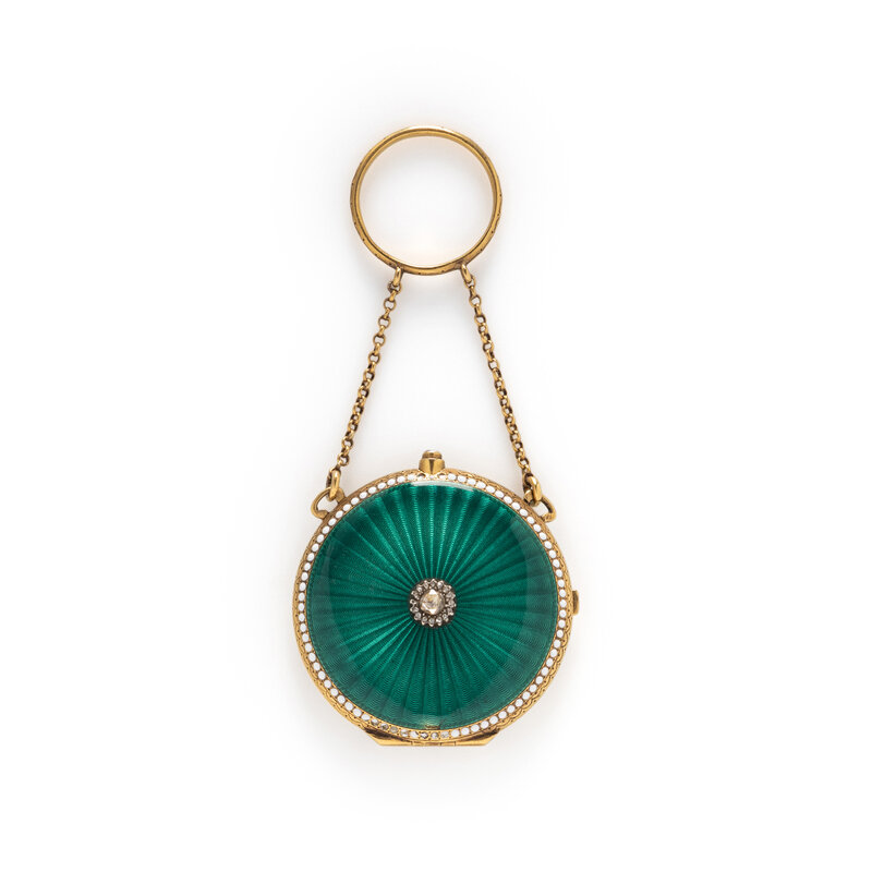 CARTIER, YELLOW GOLD, GUILLOCHÉ ENAMEL, AND DIAMOND PENDANT/CASE