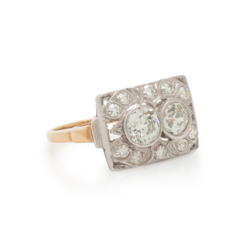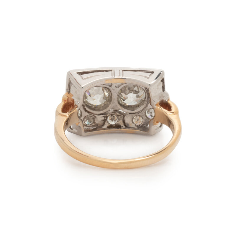 Two old European cut diamonds weighing approximately 0.85 carat total and single cut diamonds weighing approximately 0.30 carat total. 14 karat yellow gold and platinum. Ring size 5 1/2.