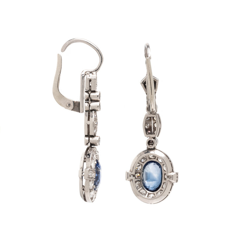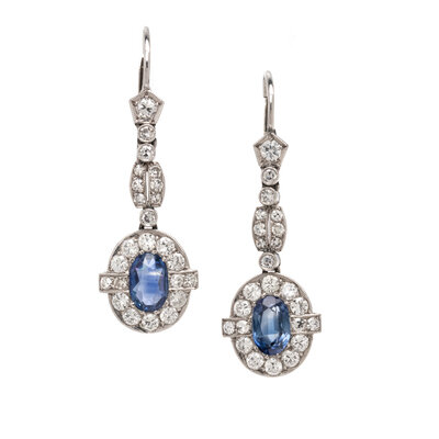 Oval cut sapphires measuring approximately 7.50 x 5.00 mm, and single and round brilliant cut diamonds. Platinum and white gold. 1 1/4 inches long.