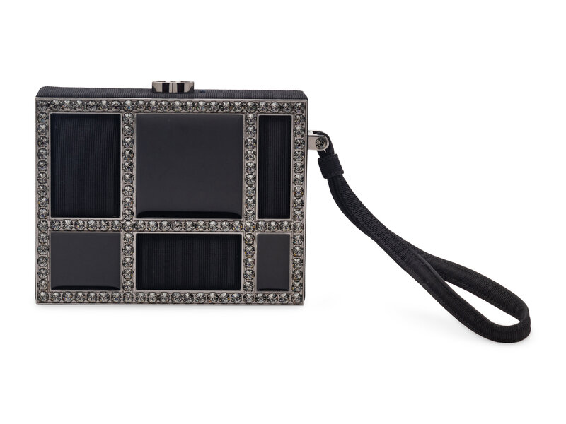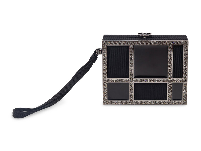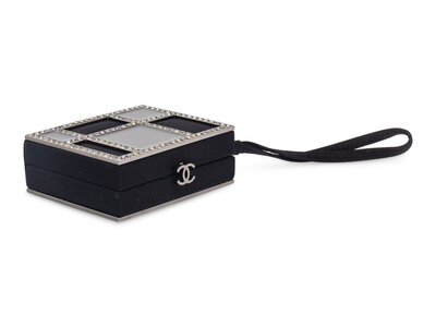 Chanel Minaudière Box Clutch in Black Grosgrain and Plexi with Rhinestone Embellishments and Gunmetal-Tone Hardware. CC Clasp and Faille Wrist Strap.