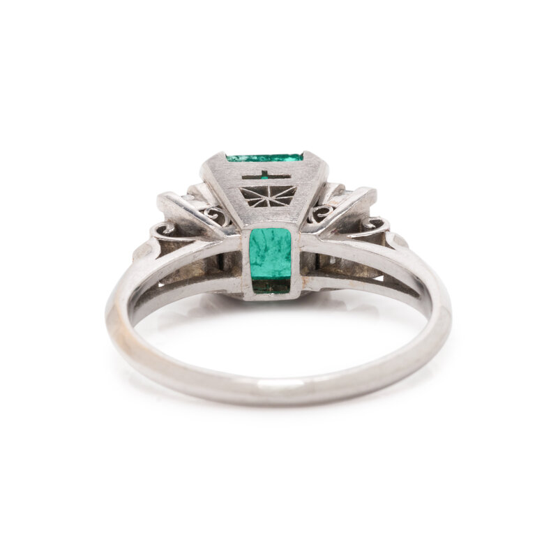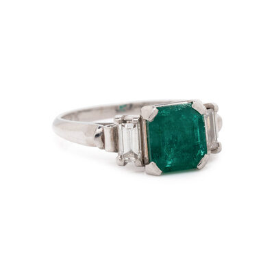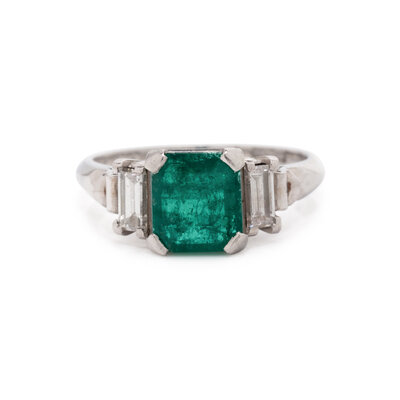 Emerald cut emerald measuring approximately 6.99 x 6.28 x 3.20 mm and baguette cut diamonds. Platinum. Ring size 4 1/2.