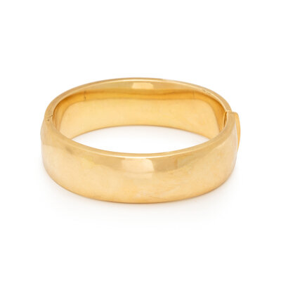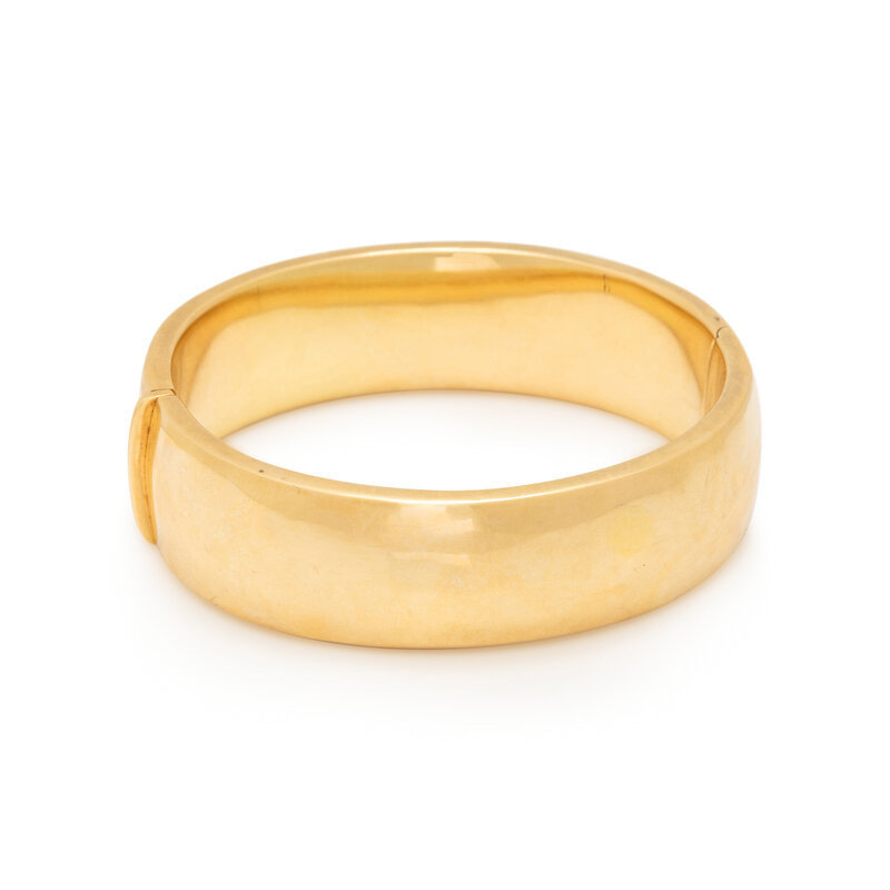 Hinged with side clasp. 18 karat yellow gold. 6 1/2 inches inner circumference, 5/8 inch wide.