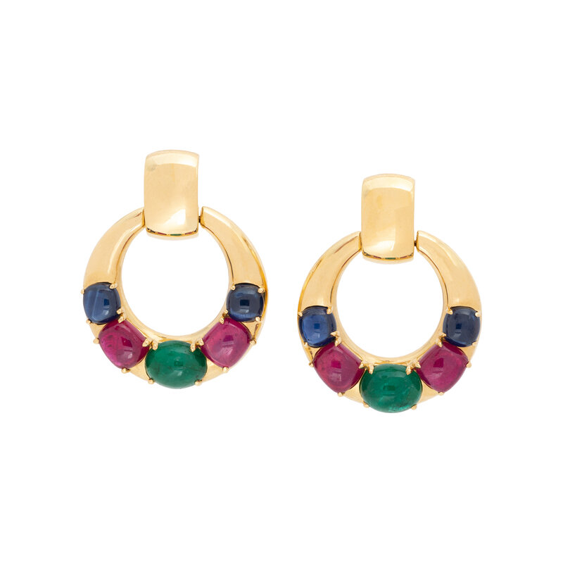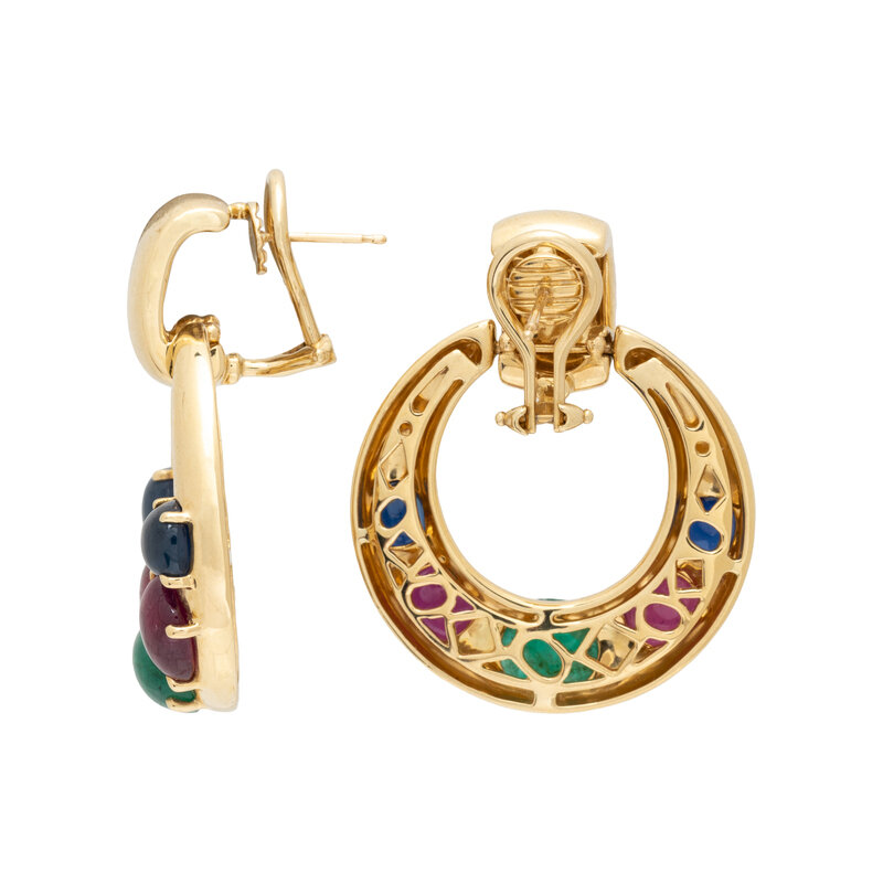 Cushion and oval cabochon sapphire, ruby, and emerald, on posts with clip backs. 18 karat yellow gold. 1 1/2 inches long.