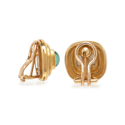 Cushion shaped cabochon green tourmaline atop mother-of-pearl measuring approximately 8.00 x 8.00 mm, on folding posts with clip backs. 19 karat yellow gold. 5/8 inch long.