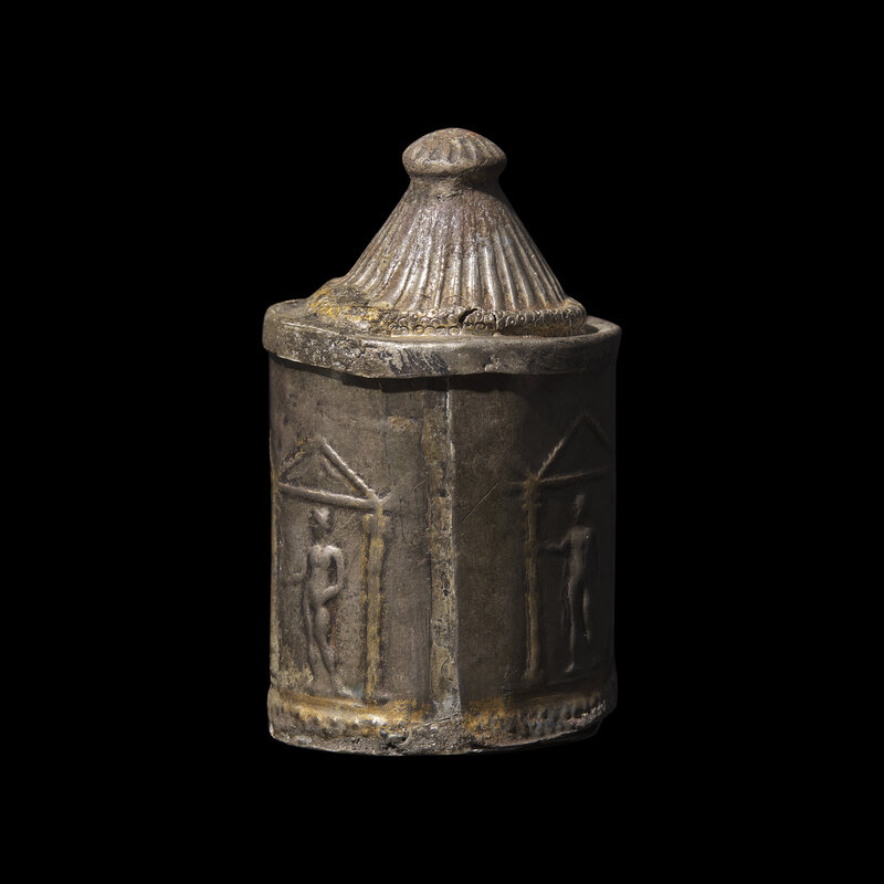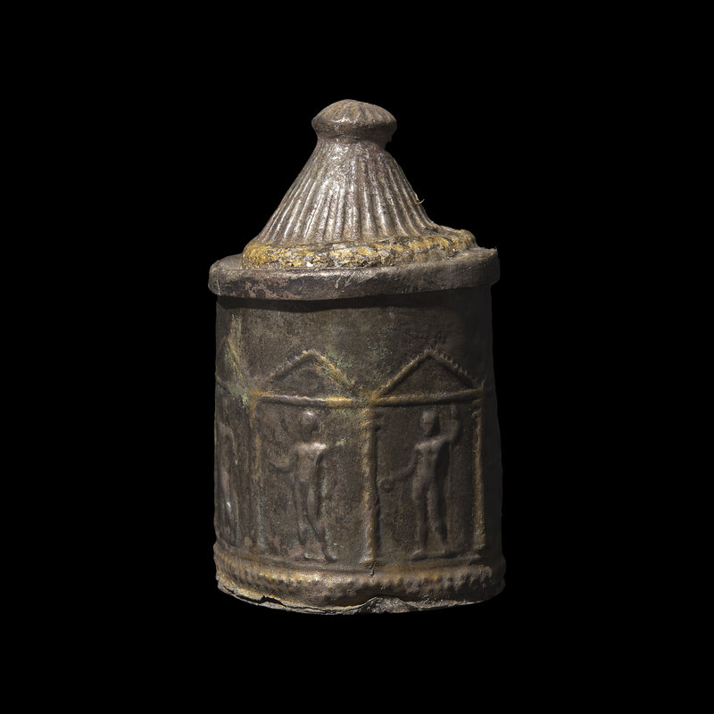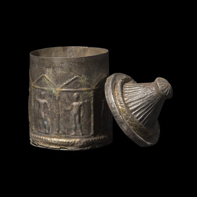 A Hellenistic Gilt-Silver Lidded Pyxis with Warriors