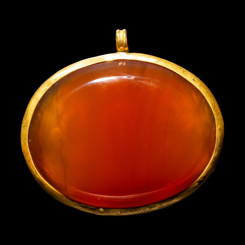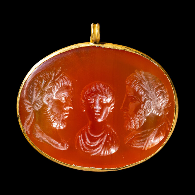 A Roman Carnelian and Gold Pendant with Emperors Balbinus, Gordian III, and Pupienus