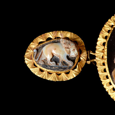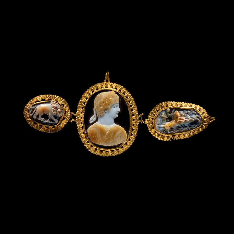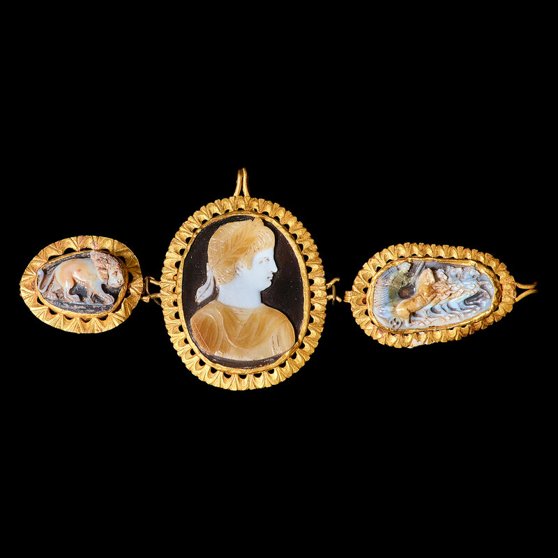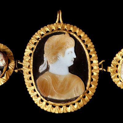 A Trio of Gold-mounted Sardonyx Cameos featuring Nero