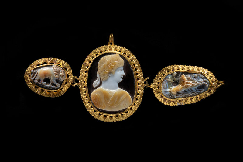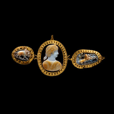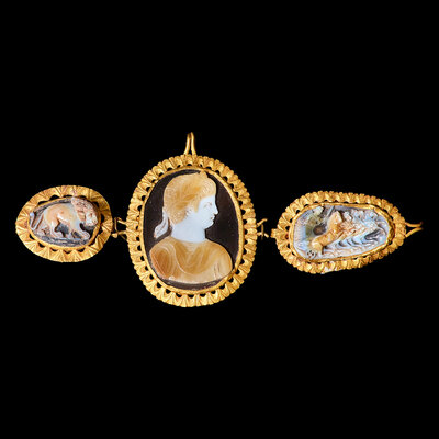 Total width 5 1/4 inches (13.34 cm); Height of central cameo 2 3/8 inches (6.03 cm).