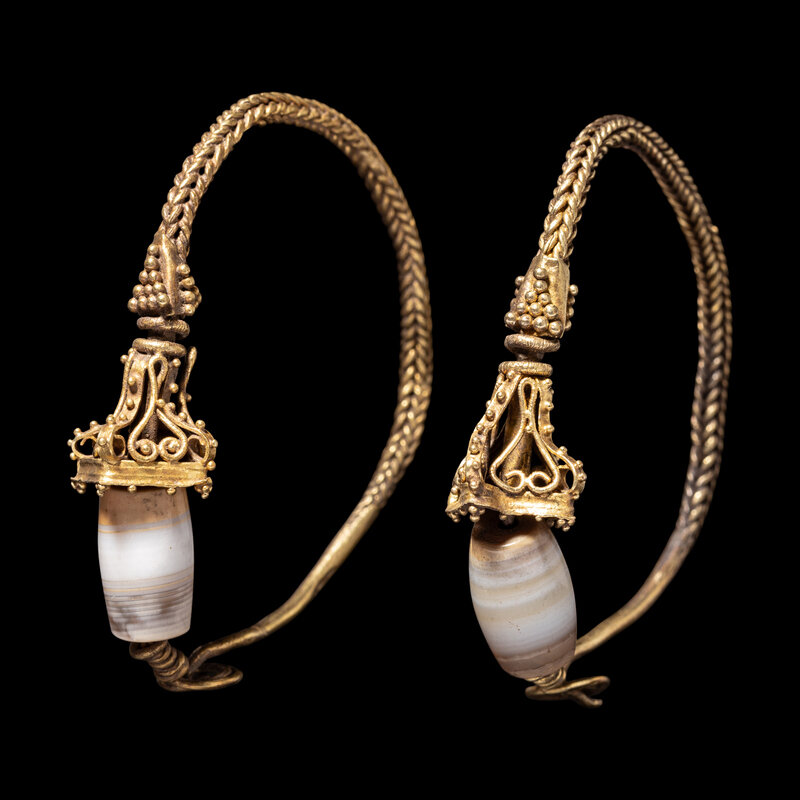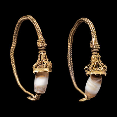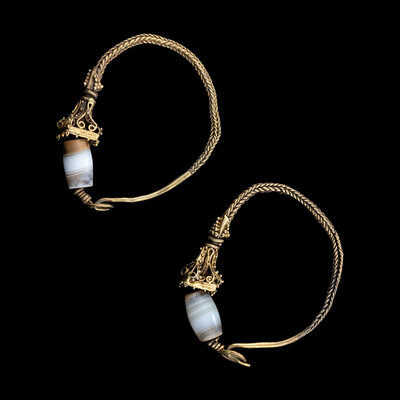 A Pair of Eastern Roman Agate and Gold Hoop Earrings