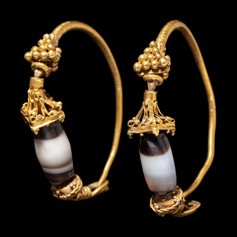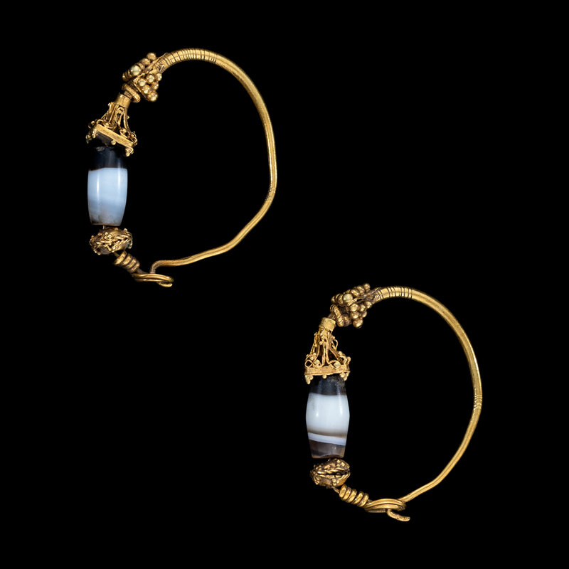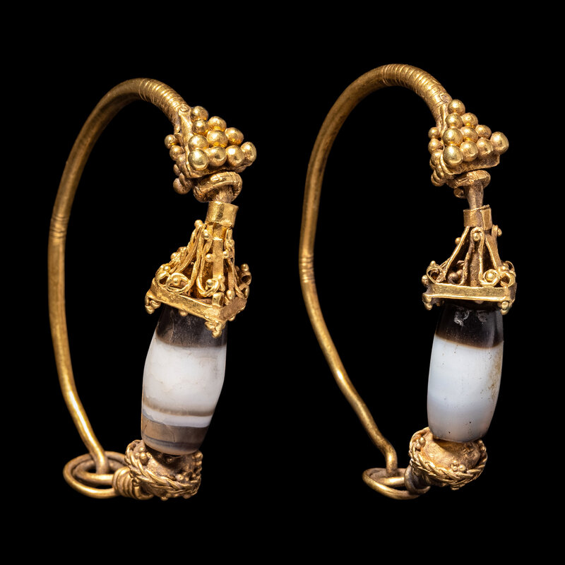 A Pair of Eastern Roman Agate and Gold Hoop Earrings
