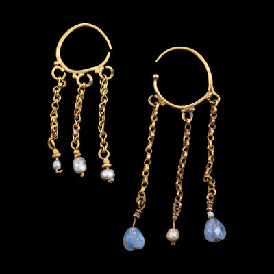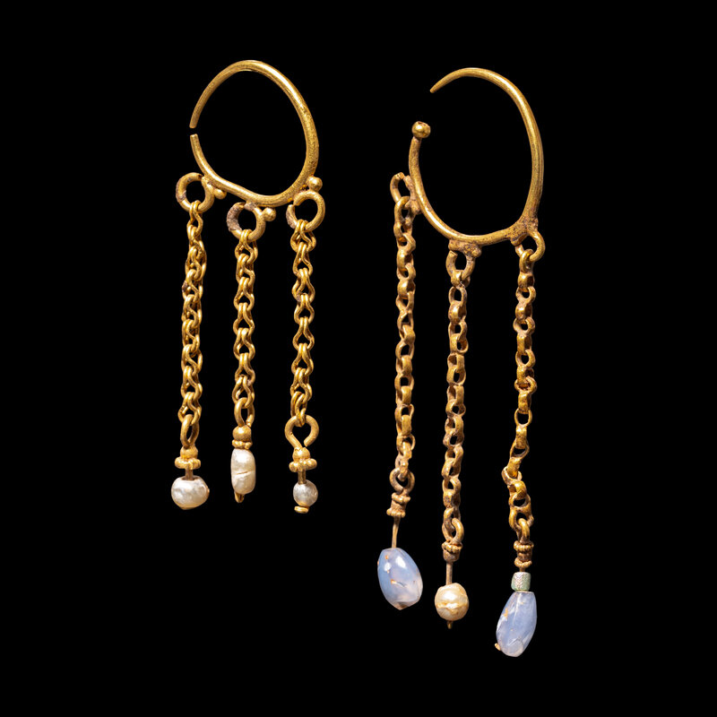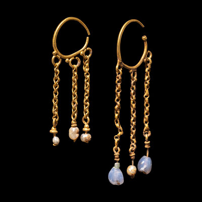 Two Byzantine Pearl, Chalcedony, and Gold Hoop Earrings