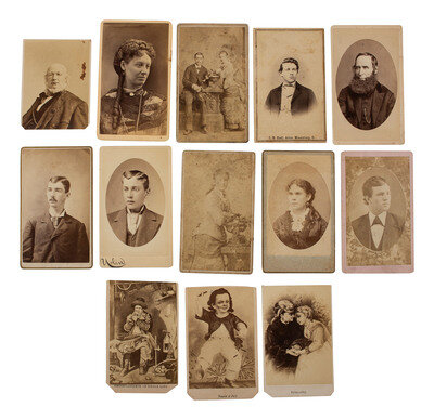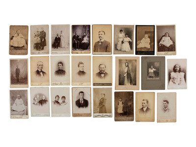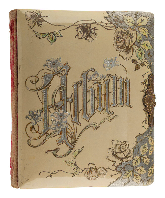 The remainder of the decorative 8 1/2 x 10 1/2 in. album is filled with CDVs, cabinet cards, and other mounted photographs credited to a wide variety of Ohio photographers including: Downing of Waynesville, OH (3); J. H. Reinhold, Weckman, J. H. Meyer, Mrs. Charles Waldack, and Young & Carl of Cincinnati, OH; Smith and Zanesville Art Company of Zanesville, OH; F. J. Buckmyer, Baker & Eberly (2), and Urlin of Columbus, OH; Armstrong, Sellers, and J. H. Shell of Miamisburg, OH; P. F. Finch of Lebanon, OH; Chesebro of Toledo, OH; Bell & Cline of Cambridge, OH; and Smith of Wilmington, OH. Other photographers credited include B. Ashbaucher of Bluffton, IN; C. A. Doane of Carrollton, MO; Andrews of Carlisle, PA: Sours of St. Joseph, MO; the Chicago Photo Co. of Chicago, IL; and more. -- Together, 37 images, mostly CDVs and cabinet cards. In generally fair condition, with varying degrees of toning, soiling, and surface wear to most.
