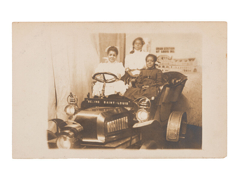 3 3/8 x 5 1/2 in. real photo postcard by an unknown photographer showing three young, Black female subjects dressed in fancy attire, posing in an automobile with a sign that reads "Seeing Saint Louis," with a rendering of "Union Station, St. Louis, MO" serving as the backdrop. While there are several known examples capturing white tourists in the same car, this is only the second known example featuring Black tourists that we have encountered. (See Swann Auction Galleries, Printed & Manuscript African Americana, 30 March 2023, Lot 273.)