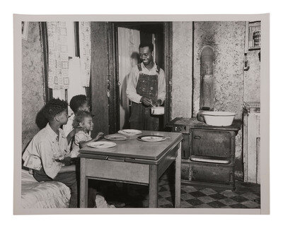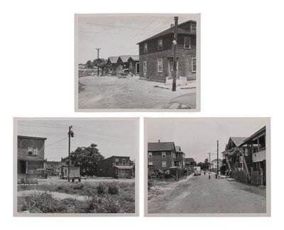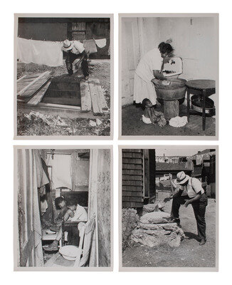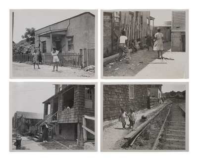 20 silver gelatin photographs, 7 x 9 in., documenting African American life on a settlement, photographer and location unknown. Several exterior views of the homes are included as well as interior views of men, women, and children performing household chores, from cleaning and hanging up the laundry to dry to making a meal for the family. Young children are also captured playing stickball and standing on railroad tracks.