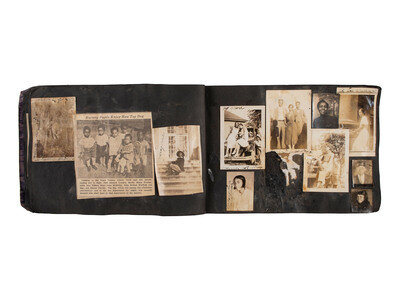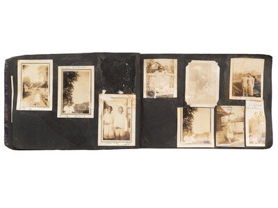 7 x 11 in. album containing approx. 66 photographs of an African American family, most approx. 3 1/2 x 2 1/2 in., mounted recto/verso to album pages. Some photos are accompanied by period captions, although many are difficult to discern. Two clipped obituaries are enclosed in the album for "Eugene Berry, Negro," who died at the age of 22 in Mount Hope, MO. Among the survivors listed was his wife Helen Berry, who may have compiled the album. Several photos of the same young woman, possibly Helen Berry based on some of the captions, are displayed throughout. Eugene Berry appears to be pictured as well, along with family and friends.