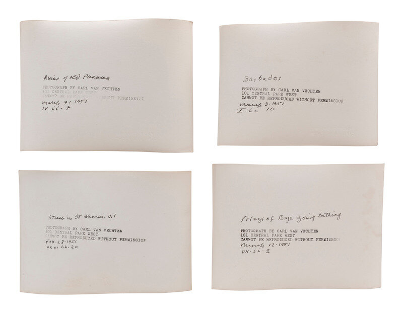A group of 130 photographs taken by Carl Van Vechten during a Caribbean cruise aboard the SS Mauretania from 28 February 13 March 1951. Each silver gelatin photograph measures 4 1/2 x 7 in. Rectos with Carl Van Vechten's embossed blindstamp. Versos with Van Vechten's studio stamp, as well as the caption, date, and inventory number, in ink.