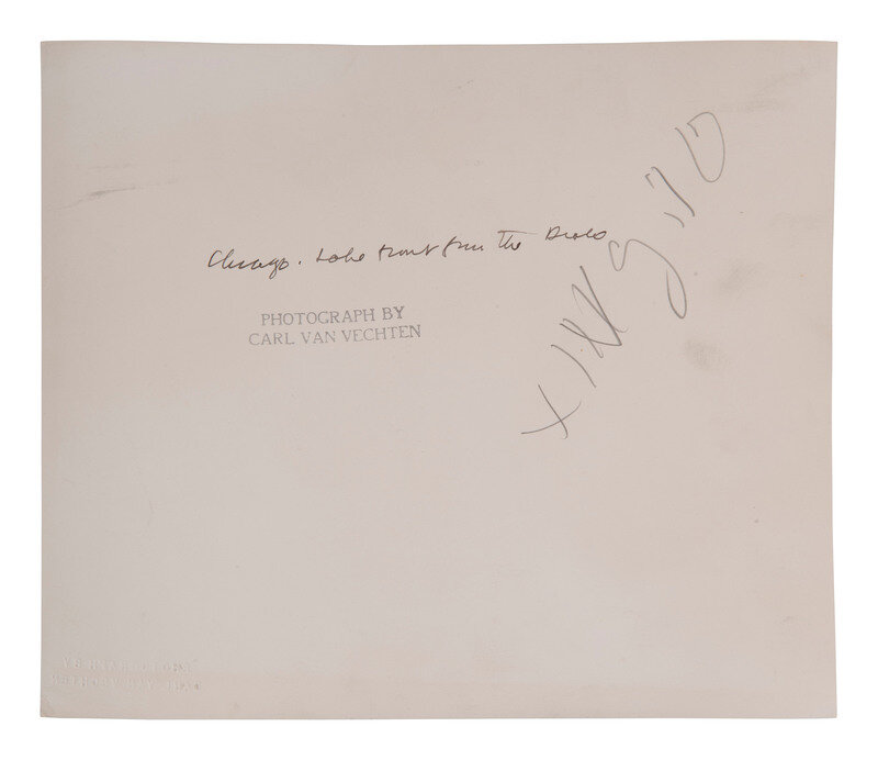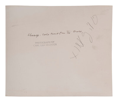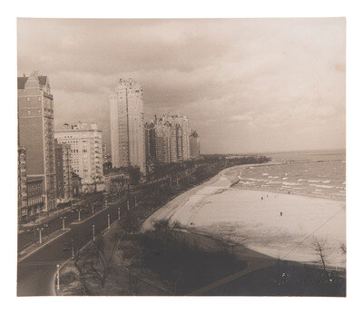 7 3/4 x 9 1/8 in. silver gelatin photograph. Recto, lower right with Carl Van Vechten's embossed blindstamp. Verso with Van Vechten's studio stamp, as well as the caption, "Chicago, lake front from the Drake." This image was almost certainly taken around the same time that Van Vechten photographed Alice B. Toklas and Gertrude Stein when they visited Chicago and stayed at the Drake Hotel in late November and early December 1934. While there, Stein gave a lecture at the Friday Club, a women’s literary society, and they took the opportunity to see the Chicago premiere of Four Saints in Three Acts, for which Stein had written the libretto.