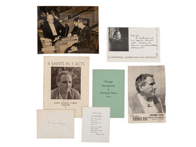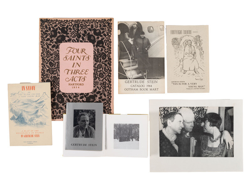 Stein, Gertrude and Thompson, Virgil. Four Saints in Three Acts. Hartford: 1934. Deluxe Souvenir Program for the Hartford premier of this opera by American composer Virgil Thomson with a libretto by Gertrude Stein. After its premiere on 7 February 1934 at the Wadsworth Atheneum in Hartford, Connecticut, the production opened on Broadway at the 44th Street Theater on 20 February 1934. -- Photograph showing Carl Van Vechten, Alice B. Toklas, and Gertrude Stein in a box at the Auditorium, Chicago, to view the first performance of 4 Saints in 3 Acts. 7 1/2 x 9 1/2 in. silver gelatin photograph. -- 4 Saints in 3 Acts. Printed handbill, May 1941. -- 4 Saints in 3 Acts. Printed program and small booklet (in silver) for performance at the Forty-Fourth Street Theatre. February 1934. Portrait of Stein on cover of each. -- Printed invitation to Columbia University Libraries Exhibition of the Writings of Gertrude Stein. -- The World is Round and how it happened. Printed handbill promoting Gertrude Stein's "First Book for Children." -- Stein, Gertrude. In Savoy or Yes is For a Very Young Man. London: Pushkin Press, [1946?]. -- Yes is a Very Young Man. Printed program and booklet for a performance at the Pasadena Playhouse. March 1946. Portrait of Stein on cover of each. -- Stein, Gertrude. Chicago Inscriptions. 1934. -- Yes is a for a Very Young Man. A typed transcript for a play by Gertrude Stein. -- 5 printed cards featuring a poem by Gertrude Stein entitled "A Village, Are You Ready Yet Not Yet." -- 2 booklets entitled Looking at Pictures with Gertrude Stein. -- A Centennial Celebration for Gertrude Stein. 3 programs promoting the exhibition produced in celebration of Stein's 100th birthday anniversary by Millersville State College, Millersville, PA, one which includes an autograph note signed by Bruce Kellner (1930-2019), an American writer, professor, and Harlem Renaissance scholar. -- A Catalogue of the Published and Unpublished Writings of Gertrude Stein, Exhibited at Yale University Library. February - March 1941. New Haven: Yale University Library, 1941. Gertrude Stein. Catalog 1964. Gotham Book Mart. 3 copies, including introduction from Carl Van Vechten. New York: [1963?]. -- And more.