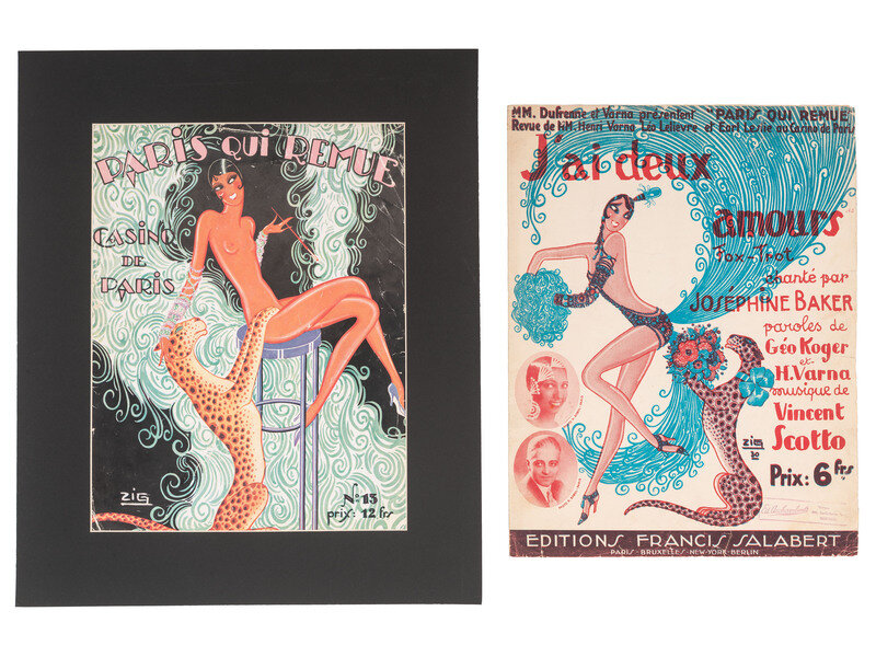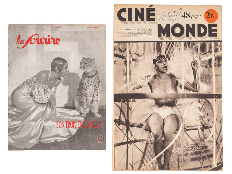 Included are: An issue of French magazine, Le Sourire, dated 26 January 1933 and featuring an image of Baker with a live Cheetah. -- An issue of French magazine, Voila, dated 3 December 1932 and featuring a half-body image of Baker posing nude but covering herself with her arms and hands. -- Sheet music for J'ai Deux Amours, a fox trot sung by Josephine Baker. Paris: Editions Francis Salabert, ca 1930. Cover art features an illustration of Baker with a cheetah behind her. -- Sheet music for The Original Charleston, which Josephine Baker famously danced to at the finale of one of her shows. Paris: Editions Francis Salabert, 1926. Cover art features an illustration of Baker dancing. -- And several other items, including 2 laminated menus from New York restaurant, Chez Josephine. -- Together, 21 pieces of vintage Josephine Baker related ephemera, with reproduction items.