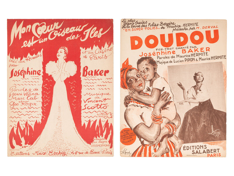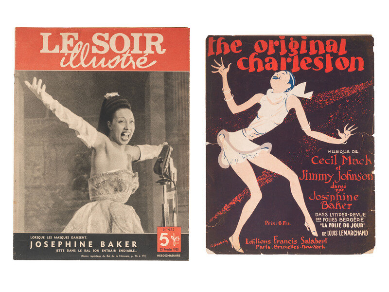 A collection of 20+ pieces of Josephine Baker ephemera including vintage sheet music, vintage magazine covers, newspapers, and more; with some contemporary reproduction photographs and other reproduced material. Housed together in a 16 x 18 x 2 in. contemporary album.